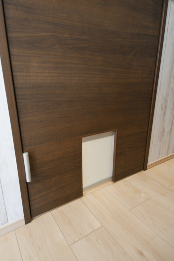 内装洗面所ドア、猫ちゃんの出入りしやすいオリジナルドア採用